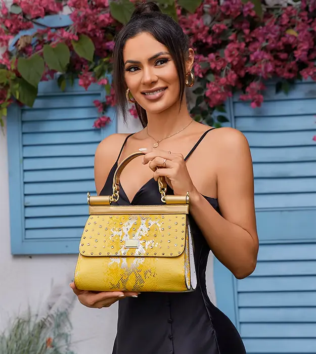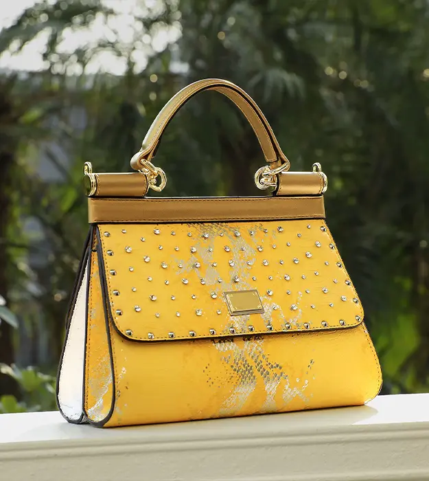 Zlatna površina torbe reflektuje više od sjaja — ona simbolizuje toplinu, optimizam i vedrinu duha.