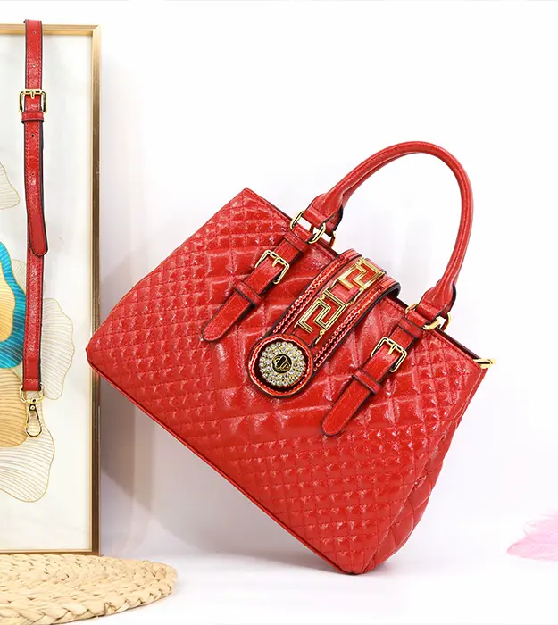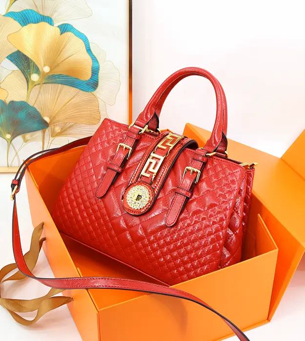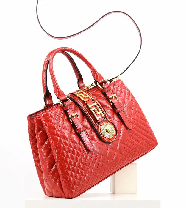 Crvena nijansa simbolizuje samopouzdanje i strast, dok zlatni detalji — kopča, ukrasni natpis i metalni elementi — unose notu glamura i prefinjenosti.
